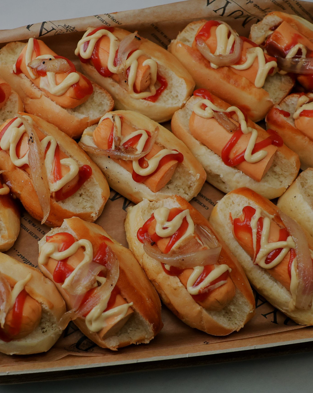 Plateau de mini hot dog, oignons croustillants et moutarde, 15 pièces