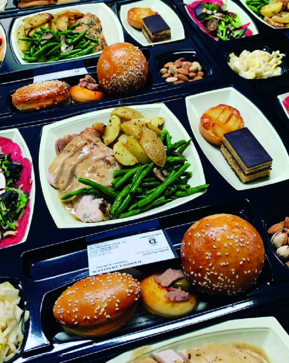 Plateau Repas Prestige composé de Carpaccio de boeuf sur de salade folle et sa sauce balsamique, mini pizza, mini navette, assortiment pistaches cajous & amandes, suprême de volaille sauce champignon, pomme de terre grenaille, haricots verts poêlés champignons poêlés, tarte au pomme, , pain mezonoth individuel, couverts, serviette